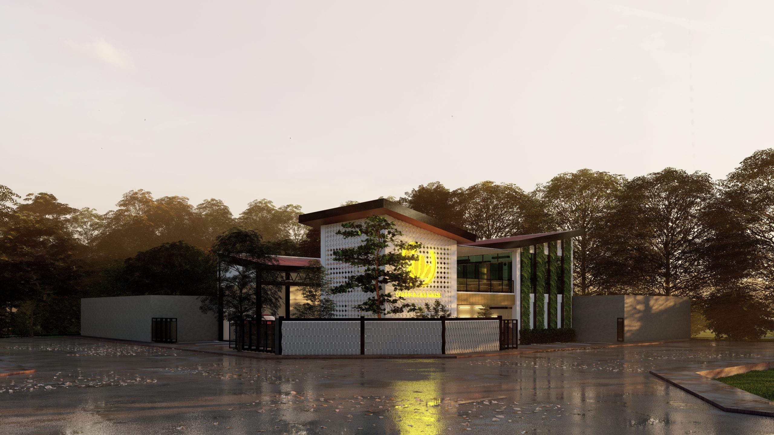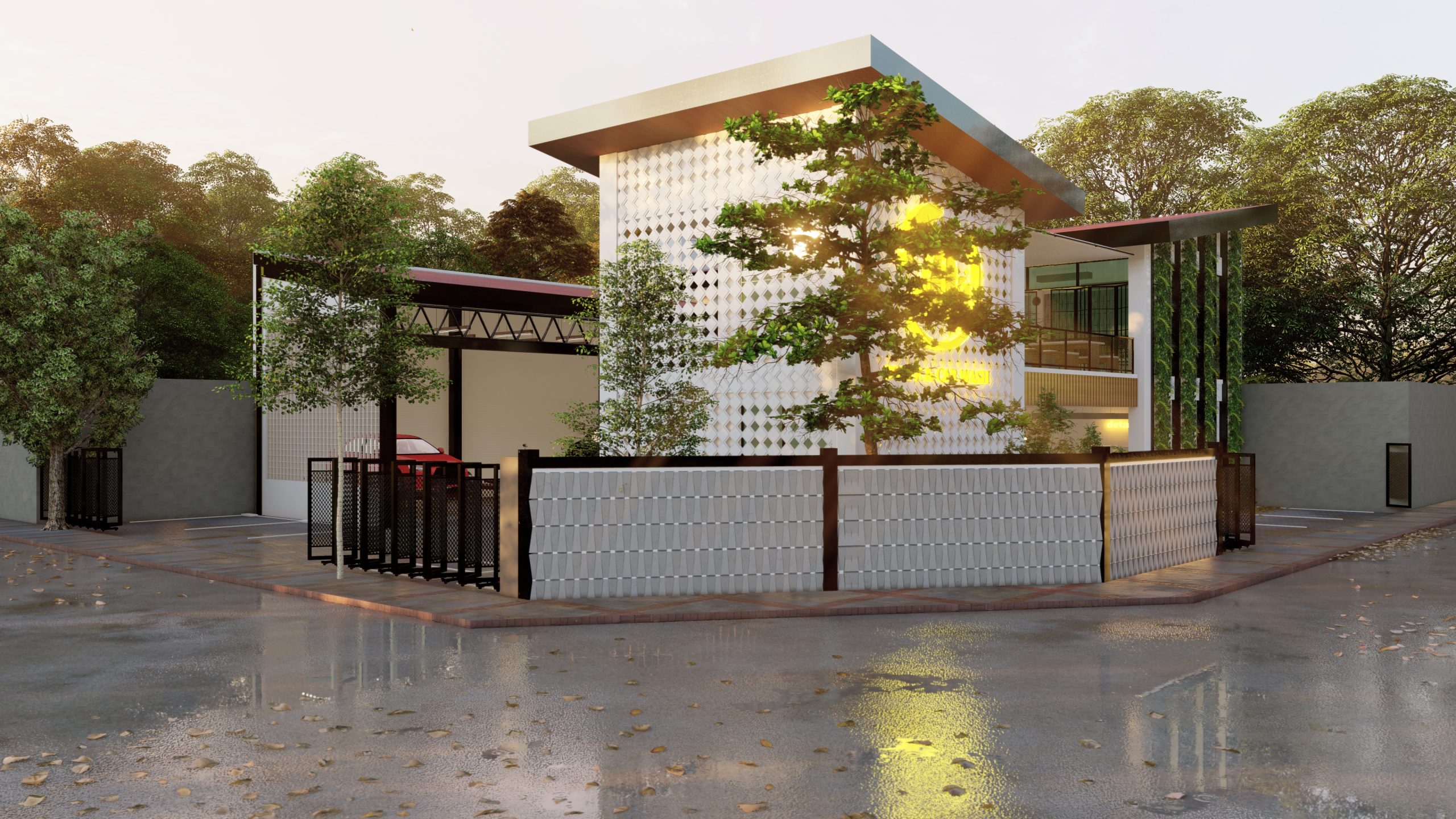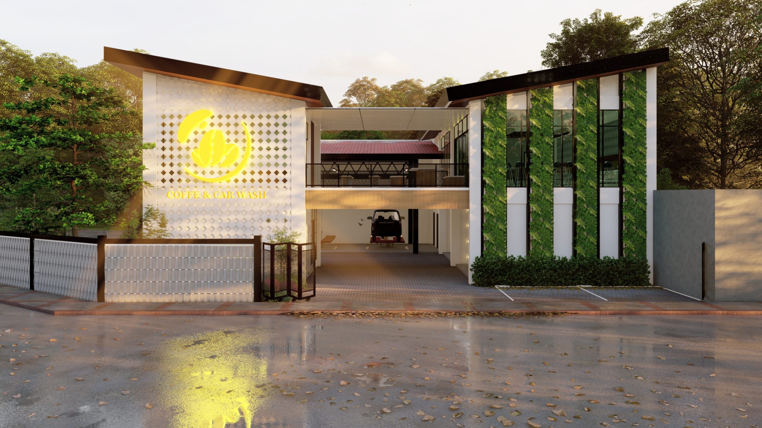 Bangunan Cafe & Car Wash ini memadukan desain modern dengan fungsi ganda yang elegan. Fasad roster berpola geometris sementara taman vertikal di sisi kanan memberi sentuhan segar dan alami. Bidang kaca tinggi menghadirkan pencahayaan alami, menciptakan suasana hangat di area kafe lantai atas. Lantai bawah difungsikan sebagai car wash dengan akses kendaraan yang praktis. Perpaduan warna putih, hijau, dan cahaya hangat menjadikannya destinasi nyaman yang menggabungkan estetika dan kenyamanan.