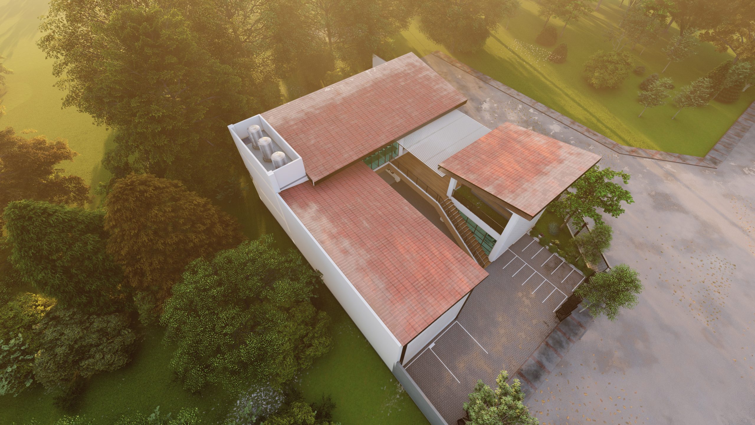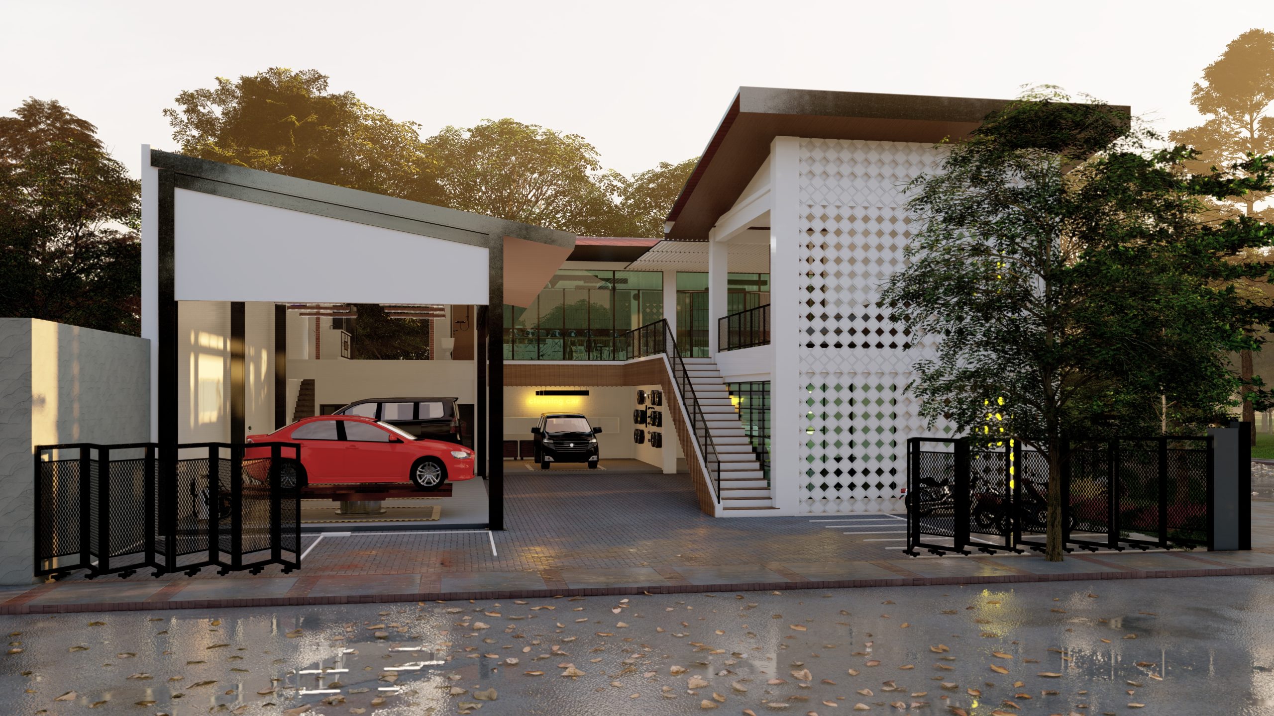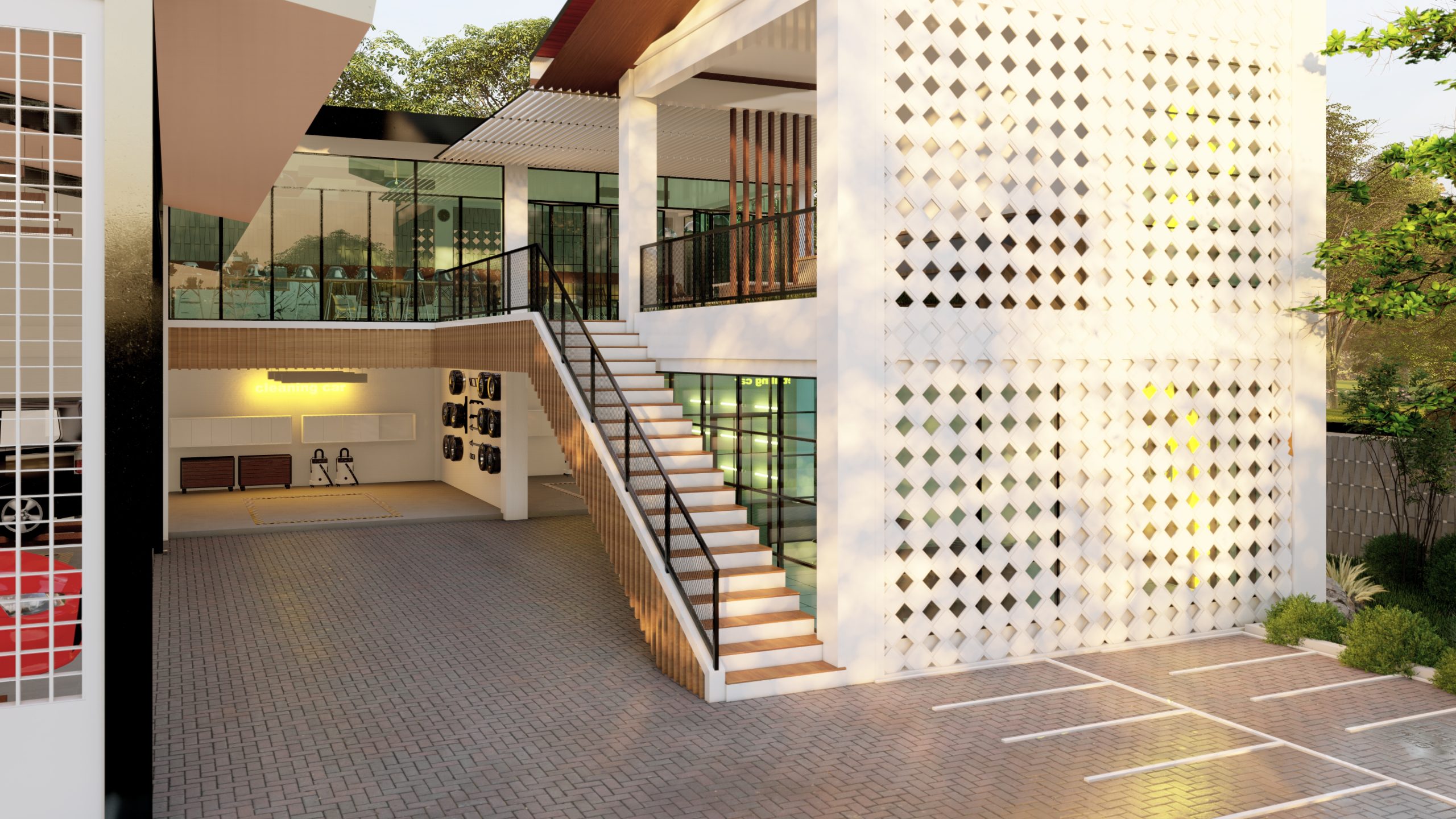 Bangunan Cafe & Car Wash ini memadukan desain modern dengan fungsi ganda yang elegan. Fasad roster berpola geometris sementara taman vertikal di sisi kanan memberi sentuhan segar dan alami. Bidang kaca tinggi menghadirkan pencahayaan alami, menciptakan suasana hangat di area kafe lantai atas. Lantai bawah difungsikan sebagai car wash dengan akses kendaraan yang praktis. Perpaduan warna putih, hijau, dan cahaya hangat menjadikannya destinasi nyaman yang menggabungkan estetika dan kenyamanan.