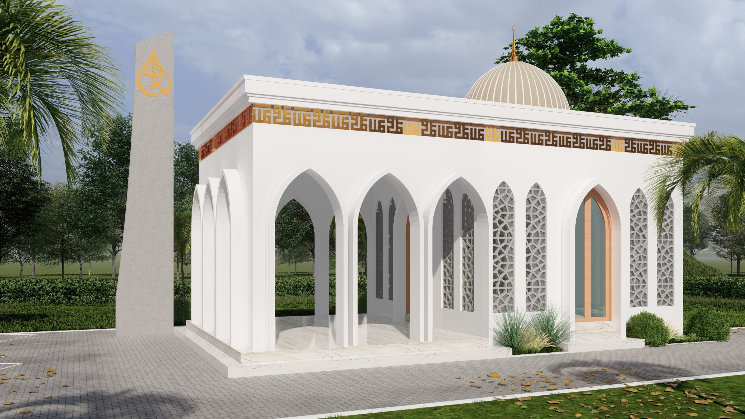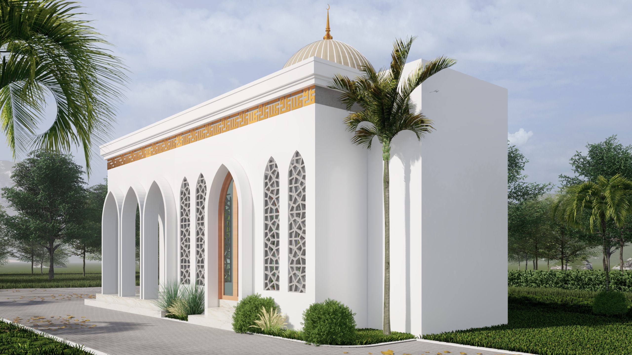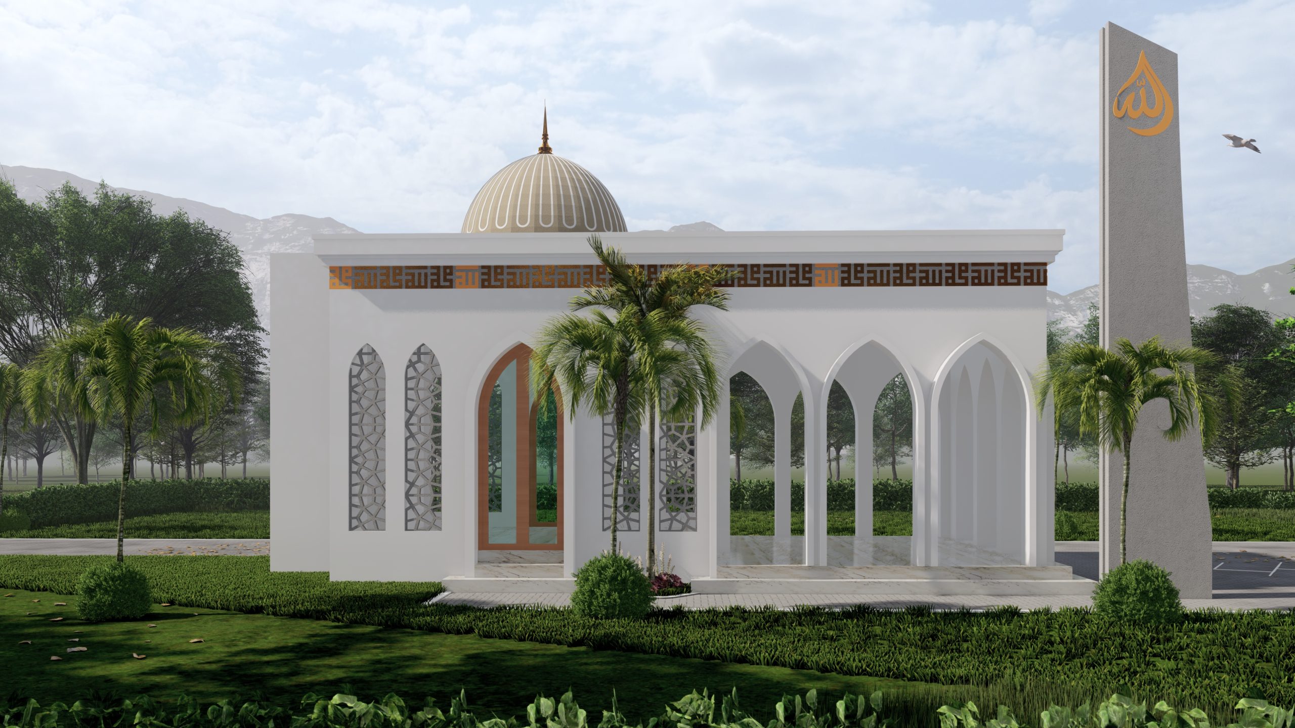Masjid ini dirancang dengan presisi, memadukan kemegahan warisan Islam dengan sentuhan modern yang elegan. Lengkung runcing pada fasad dan pola mashrabiya menghadirkan kesan anggun, sementara kubah proporsional dan kaligrafi Kufi berlapis emas mempertegas kemuliaannya. Warna putih murni dipadu aksen emas dan marmer menciptakan suasana mewah nan teduh, menjadikan masjid ini bukan hanya tempat ibadah, tetapi juga simbol keindahan dan keabadian.